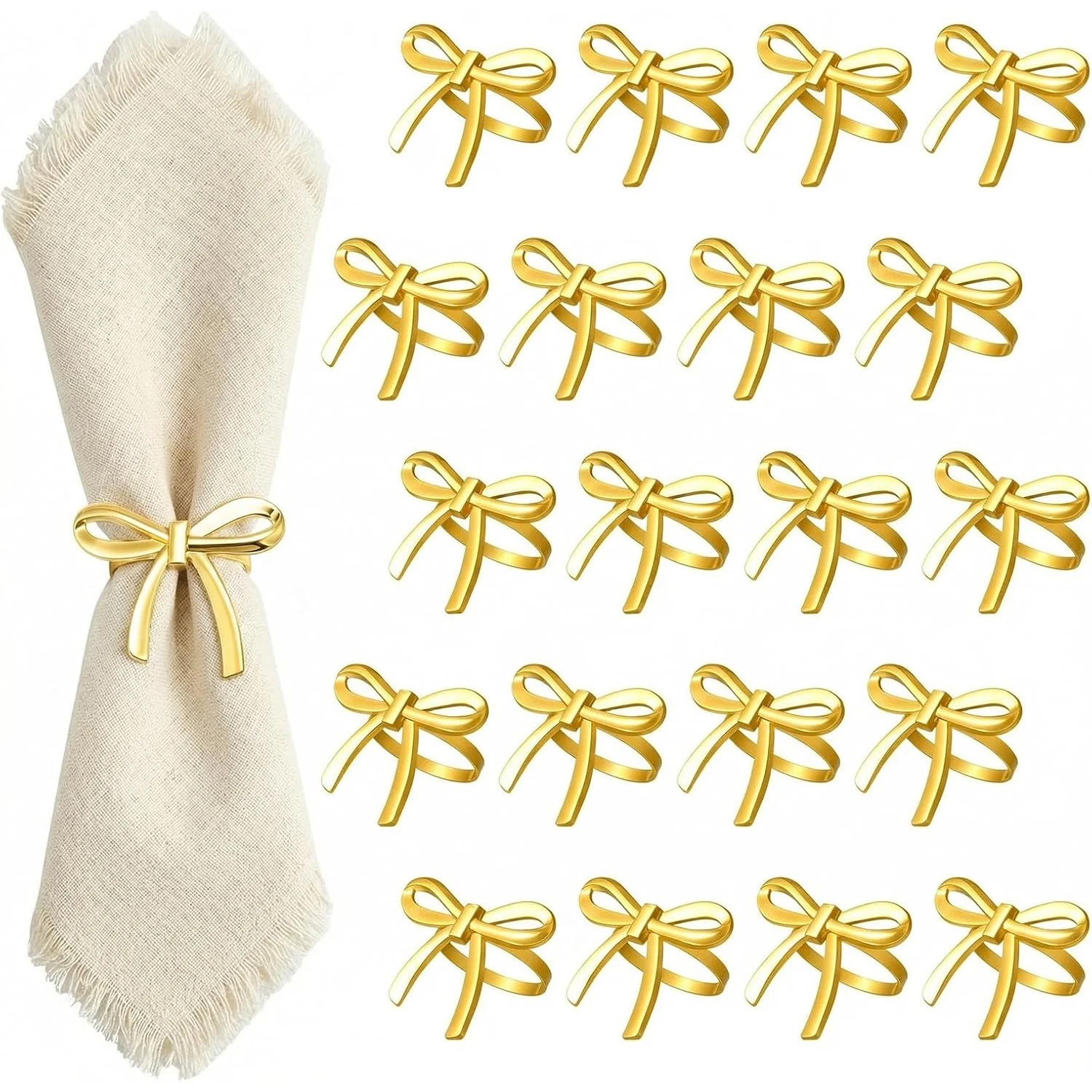 These alloy bow tie napkin rings add a refined touch to any table setting. The elegant bow design enhances formal and festive dining arrangements. Made from durable metal alloy, they are built for long-term reuse. They are perfect for weddings, banquets, and dinner parties. The polished finish creates a sophisticated and stylish look. These rings help keep napkins neatly folded and organized. Suitable for both home dining and professional event setups. They pair well with modern and classic table themes. Easy to clean and store after use. These napkin rings elevate any gathering with simple elegance.